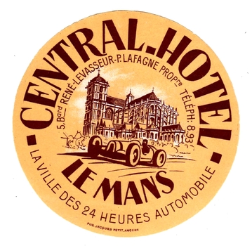 Description: Vintage French diecut luggage label for the CENTRAL HOTEL in LE MANS with race