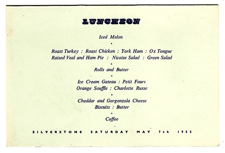 Description: Vintage British menu card for luncheon held at Silverstone,